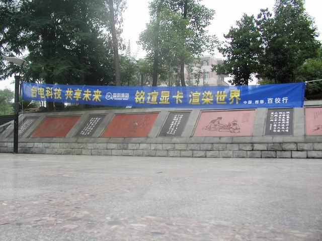 1   “臺(tái)電科技 共享未來(lái),銘瑄顯卡  渲染世界” 中國(guó).西部.百校行活動(dòng),于2005年5月28日下午5點(diǎn)來(lái)到了四川師范大學(xué)。我們一進(jìn)校門(mén),可很清楚的看見(jiàn)紅色的條幅“熱烈歡迎xxxxxxxxxxx的各位領(lǐng)導(dǎo)”,此時(shí)我們的心情無(wú)比的激動(dòng)。