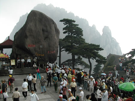 為了節省體力,大家一同坐纜車到達了玉屏峰,此峰可真是人山人海,寸步難移。圖中的松樹,既是大名鼎鼎的迎客松了。