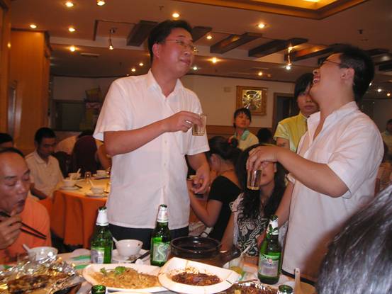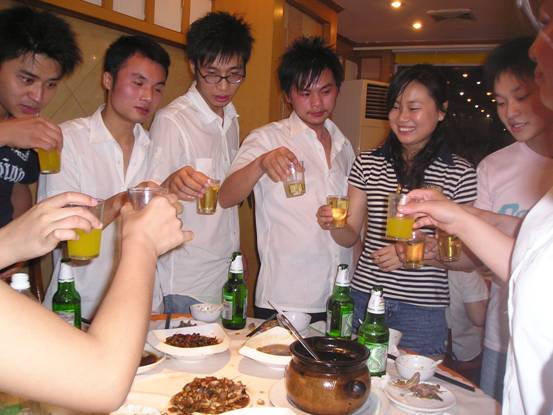 不能光顧著吃菜呀,菜可是用來下酒的,來!白酒滿上!先干為敬啊!