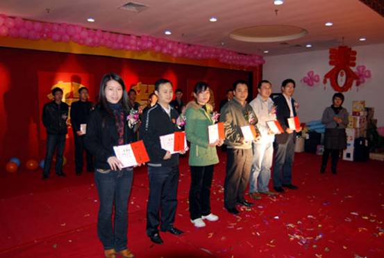 大會(huì)第一項(xiàng)是表彰2007年工作最勤懇的員工的敬業(yè)員工獎(jiǎng),他們2007年沒有任何請假、遲到、曠工、早退的記錄,做到這一點(diǎn)還真不容易,值得嘉獎(jiǎng)。