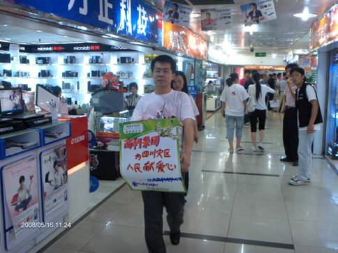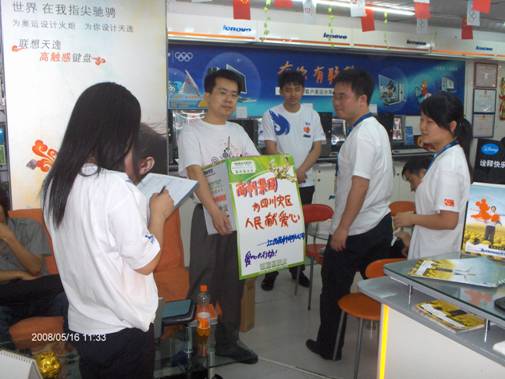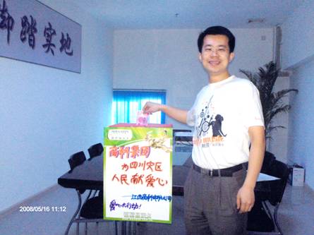 1、一方有難八方支援一直是中華民族優良的傳統,天災無情人有情,在我們的兄弟姐妹正在受到災難折磨的時候,作為一個有良知的中國人,我們是不是更應該拿出自己的一片愛心,有人的出人,有力的出力,用我們的愛心來支援一下災區的同胞們?江西商科電腦公司吳暉經理率先向災區進行了愛心捐款。