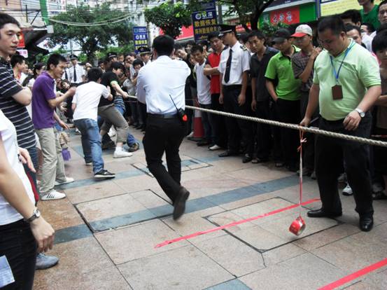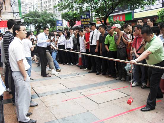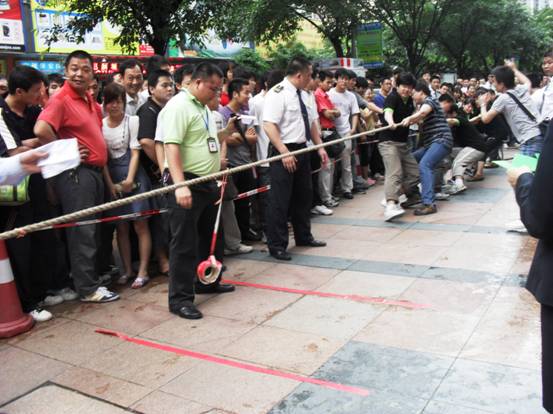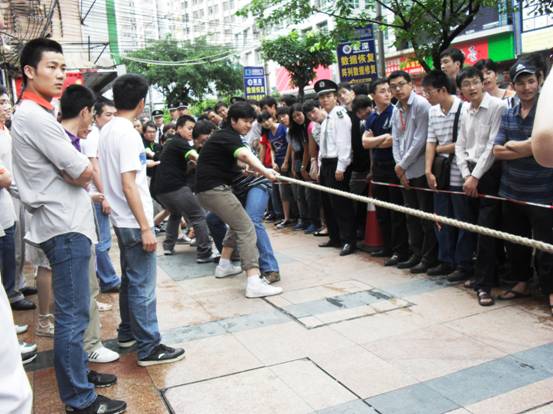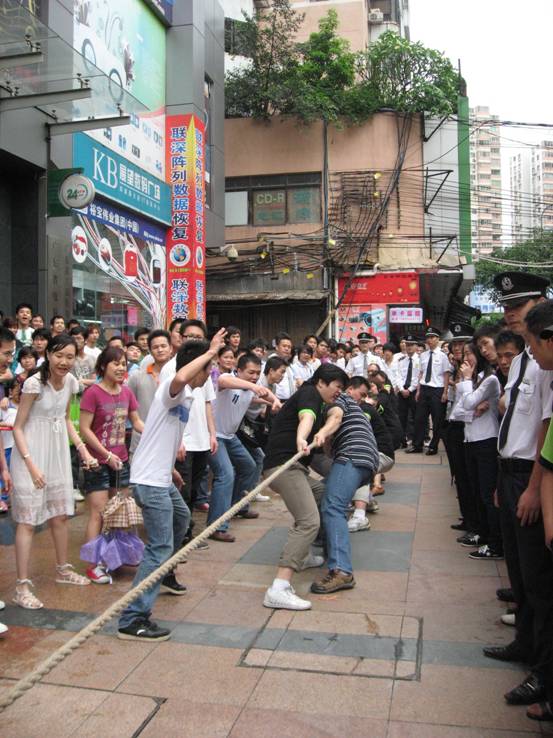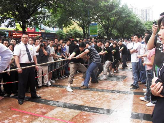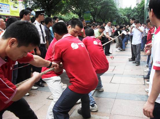 加油加油加油,,隊員們連吃奶的力都使上了,標志帶向前移動一下,眼看就要被拉過去了,但每一個人都沒有放棄,使出全身力量,拉拉隊的聲音早就沖過云宵,叫喊聲響成一片,每個人都快瘋掉。只見秦明和盧健華兩位份量級的人物向后一倒,倒在地上,紅色標記帶隨著這一拉,越過紅線,大家跳了起來,第一局,贏啦!