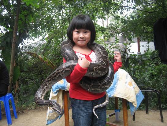 海瑞祠 隨后我們又來到了最后一站蛇島。大部分人對蛇比較畏懼,島上有劇毒的眼鏡蛇,竹青蛇,五步蛇,也有常見的無毒蛇,金環(huán)蛇,更有大大的蟒蛇。同事的女兒萱萱和大蟒蛇拍照了,膽子可真不小,隨行人員也只有這個小不點敢與蟒蛇合影。