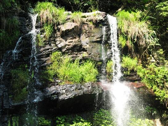 沿著曲折的棧道,我們難得看到兩支瀑布一大一小在同一巖石上傾注,猶如夫妻朝夕相伴,夫妻瀑布是也。 景致最美的是小黃果樹瀑布,瀑高20余米,瀑寬約15米,貼石壁傾斜而下,水勢滔滔,水流飛泄時,因碰撞凹凸不平山巖而產(chǎn)生水花四濺,飛飛揚揚,猶如大霧彌漫,雄渾瑰麗。