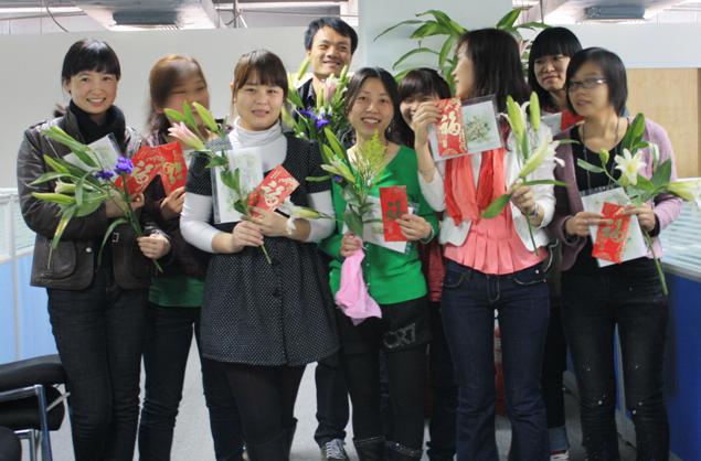 值3月8日來臨之際, 謹(jǐn)向公司所有女職員致以最美好的祝福! 3月8日,北京分公司為女員工舉辦了一場(chǎng)“美麗綻放,祝福女性”活動(dòng)。活動(dòng)中男同事們盡顯紳士風(fēng)采,出色地完成了綠葉的角色。 早上,女同事的辦公桌上都放著公司在她們到來前準(zhǔn)備好的祝福卡片。看都卡片上溫馨的話語,讓女同事們感動(dòng)不已。9:30剛剛到,一大束鮮花就被送到公司辦公室,鮮花的到來將“美麗綻放,祝福女性”活動(dòng)推向了高潮。寫字樓辦公區(qū)的女同事先進(jìn)行了合影,之后大束鮮花被拆開。行政人事部宣布鮮花派送開始,男同事們便一擁而上地來取花,搶花的場(chǎng)面真是別開生面。