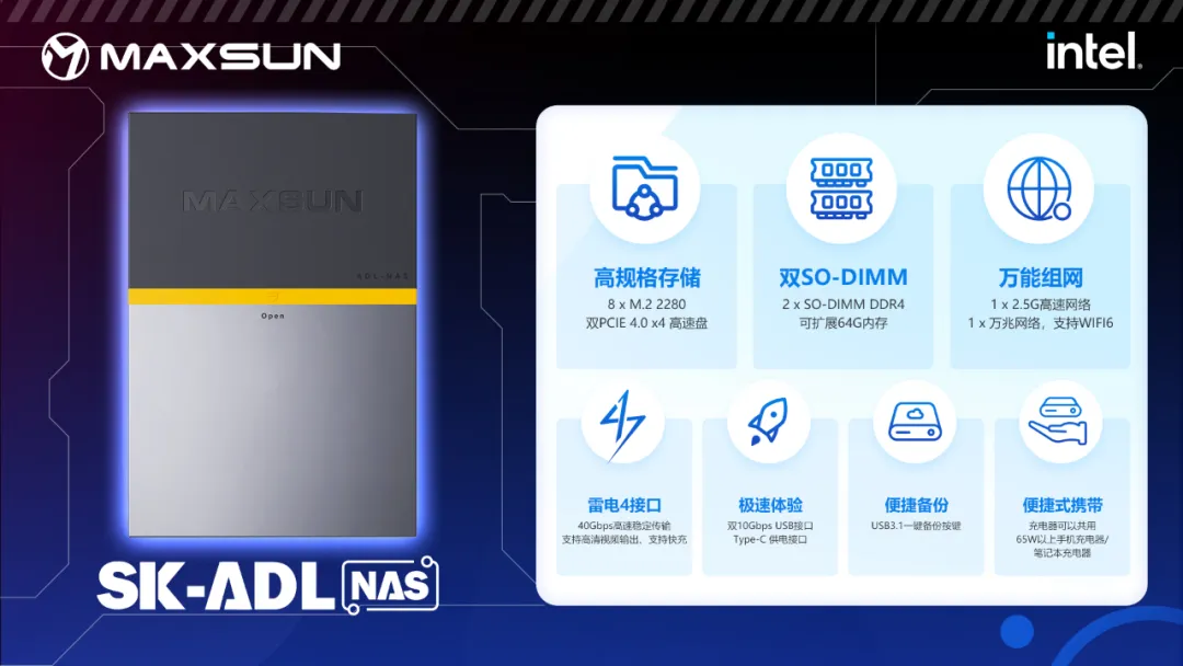 MS-ADL NAS作為一款8盤位M.2便捷式的NAS整機設計,搭配全金屬外殼,簡約時尚風格;整機搭配I3-1215U,雙PCIE 4.0X4高速盤,多場景流暢使用;雙SO-DDR4,1*2.5G+1*萬兆超高速網口支持超高速上傳下載。整機支持雷電四接口,雙10Gbps USB高速體驗,以及支持USB3.1一鍵備份按鍵。