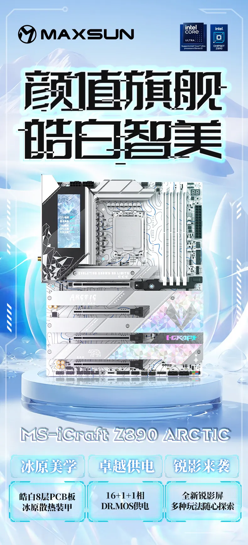 MS-iCraft Z890 Arctic(北冰洋),新一代冰原美學設計,科技與自然美感融合給用戶帶來不一樣的視覺與性能體驗。擁有2x Thunderbolt™ 4,高達9個USB 10G接口,1*SFF-8654 4i拓展接口,PCIE5.0 x16顯卡插槽+PCIE5.0 x4 M.2接口,支持PCIE5.0通道拆分,外觀性能雙旗艦。