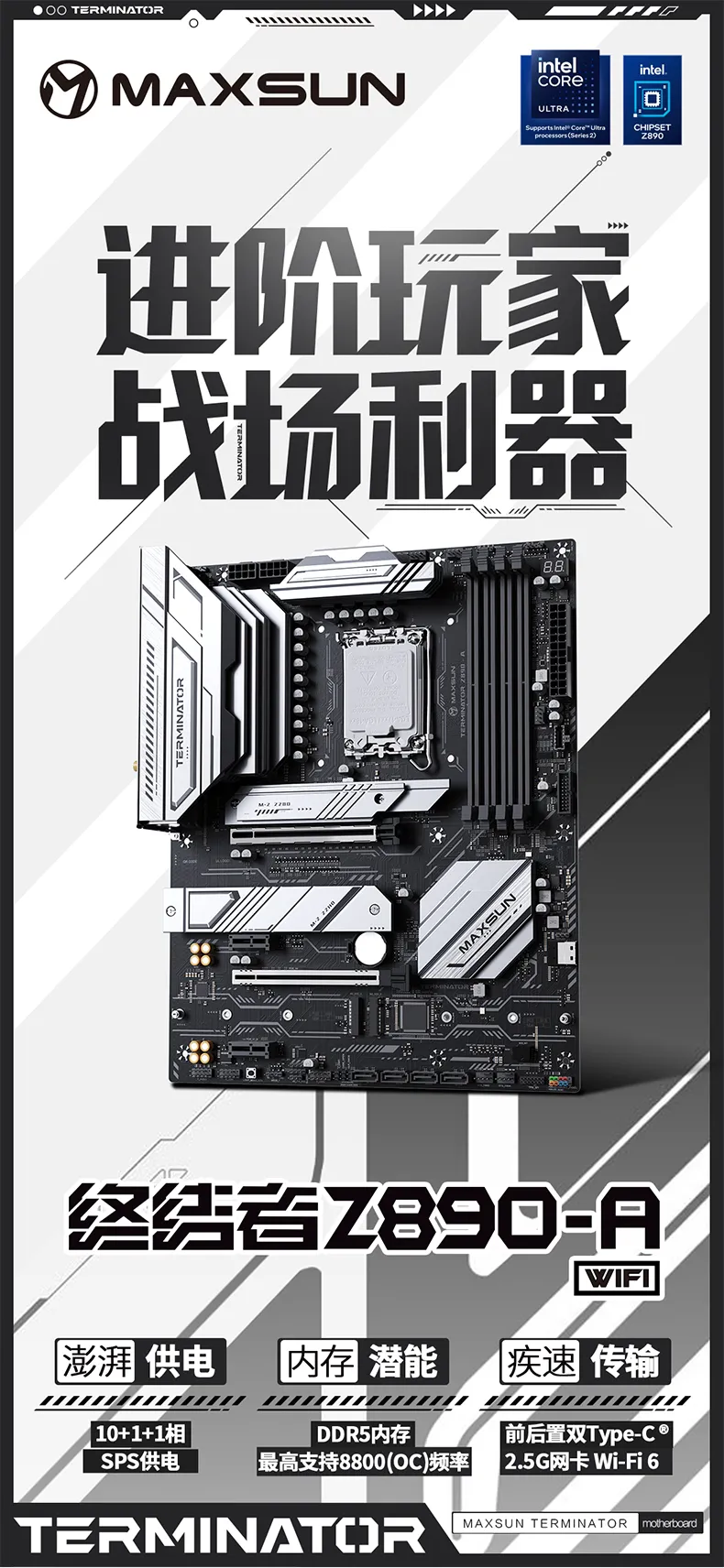 MS-Terminator Z890-A WIFI,充分釋放Ultra9 強悍性能,同時擁有Thunderbolt™ 4接口和PCIE5.0 x16顯卡插槽+PCIE5.0 x4 M.2接口,1*SFF-8654 4i拓展接口,Z890高性價比之選。