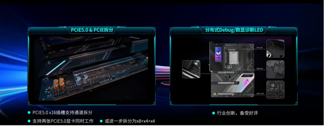 在人性化設計方面,800系主板也優化了各種細節,力求為用戶呈現更優質便捷的DIY裝機體驗。PCIe快拆系統,一鍵拆裝,輕松裝卸;Wi-Fi天線快裝接口,卡扣式設計,安裝簡便;分布式Debug燈和數顯診斷LED,輕松找到故障位置;PCIe5.0&PCIe拆分,不僅支持兩張顯卡同時工作,還可以支持三顯卡使用。