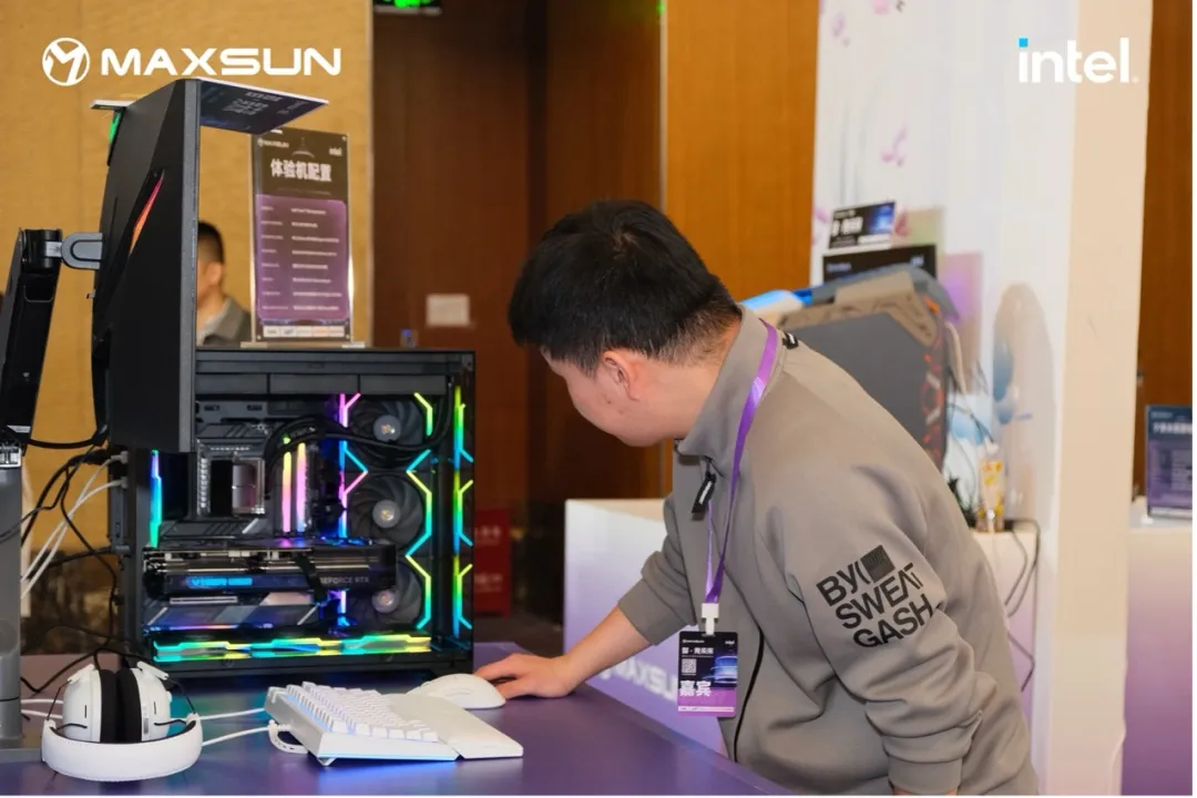 在新品發布結束后,嘉賓們自由享受茶歇或到展示區感受800系新品主板的強大性能和出眾外觀。現場除了展示800系主板單品外,還有多部搭載Intel® Core™ Ultra processors處理器的游戲電腦供嘉賓體驗。