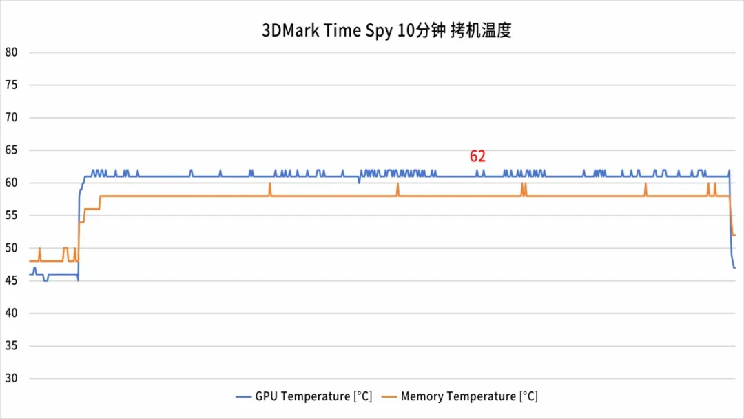 除了頻率優勢,散熱效能在顯卡的穩定性和耐用性方面同樣至關重要。銘瑄 Intel Arc B580顯卡采用正逆轉導流散熱設計,相鄰風扇的旋轉方向不同,有效減少繞流,增加進風量,從而顯著提升了散熱效能。以MAXSUN Intel Arc B580 iCraft 12G為例,在進行10分鐘的Time Spy烤機測試時,顯卡溫度僅為62度,在高負載運行時仍能保持低溫,穩定輸出性能。這種優秀的散熱設計不僅延長了顯卡的使用壽命,也為用戶提供了更佳的使用體驗。