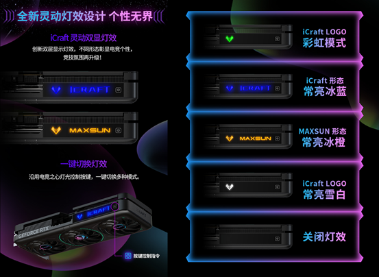 接口方面,DP*3+HDMI的全接口組合支持多顯示器連接,滿足不同顯示設備的使用需求。值得一提的是,全新iCraft靈動雙顯燈效極具特色,不同形態彰顯獨特電競個性,競技氛圍再升級;更支持一鍵切換多種模式,讓你的電競主機極具辨識度,成為全場焦點。