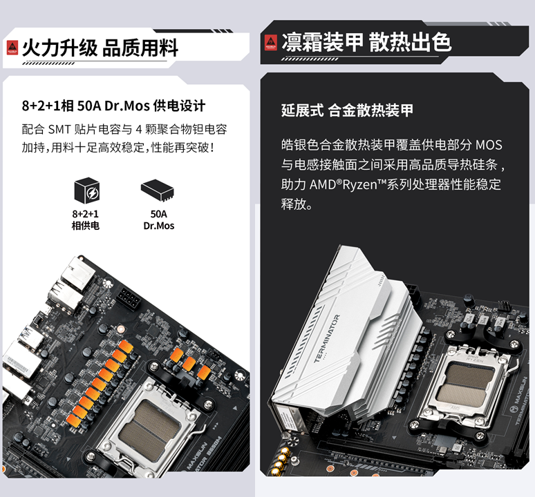 強(qiáng)悍性能的背后,是十足的用料。銘瑄Terminator B650M WIFI6主板采用8+2+1相 50A Dr.Mos 供電設(shè)計(jì),配合高品質(zhì)的SMT貼片電容與聚合物鉭電容,能夠?yàn)锳MD 銳龍?zhí)幚砥魈峁┓(wěn)定且強(qiáng)勁的電力支持。散熱方面更是誠意滿滿,皓銀色合金散熱裝甲覆蓋供電部分MOS與電感接觸面之間采用高品質(zhì)導(dǎo)熱硅條,如同給核心部件穿上 “降溫鎧甲”,助力AMD銳龍?zhí)幚砥餍阅芊(wěn)定,為用戶提供可靠的使用體驗(yàn)。
