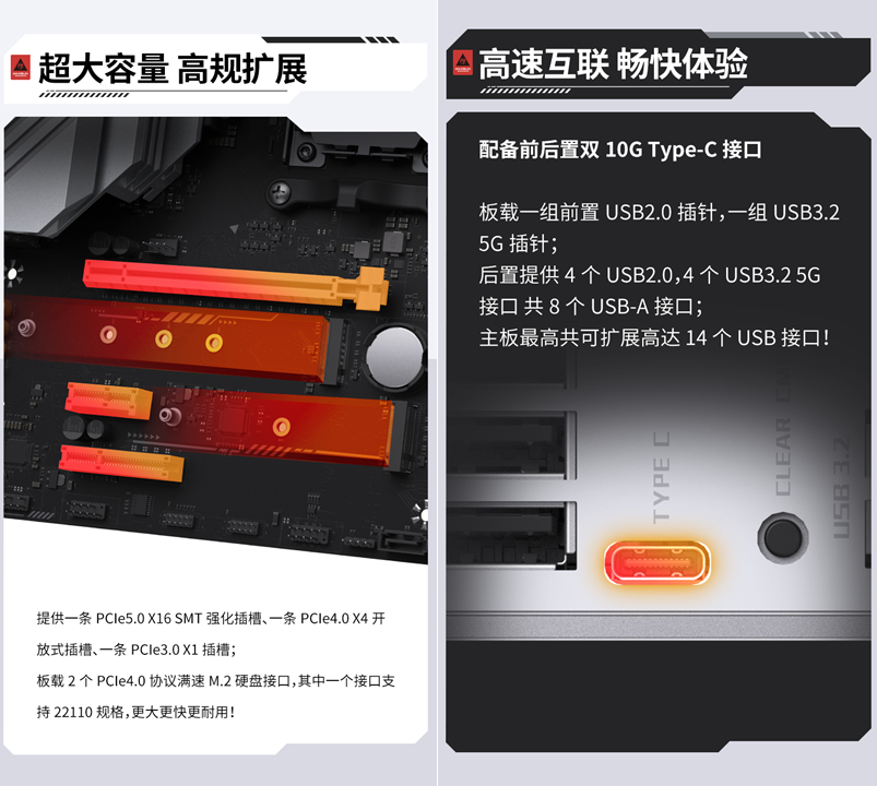 擴(kuò)展能力方面,更是做到了 “全場(chǎng)景覆蓋”, 讓拓展需求無需妥協(xié)。該主板提供一條PCle5.0 X16 SMT強(qiáng)化插槽、一條PCle4.0 X4開放式插槽、一條PCle3.0X1插槽;板載2個(gè)PCle4.0協(xié)議滿速M(fèi).2硬盤接口,其中一個(gè)接口支持 22110 規(guī)格,更大更快更耐用。且接口十分豐富,擁有前后置雙10G 速率Type-C接口,可擴(kuò)展高達(dá)14個(gè)USB接口,大大提高了擴(kuò)展能力,無論是連接高速外設(shè)、多屏顯示還是充電需求,都能輕松應(yīng)對(duì),全板無沖突設(shè)計(jì)讓拓展更隨心所欲。