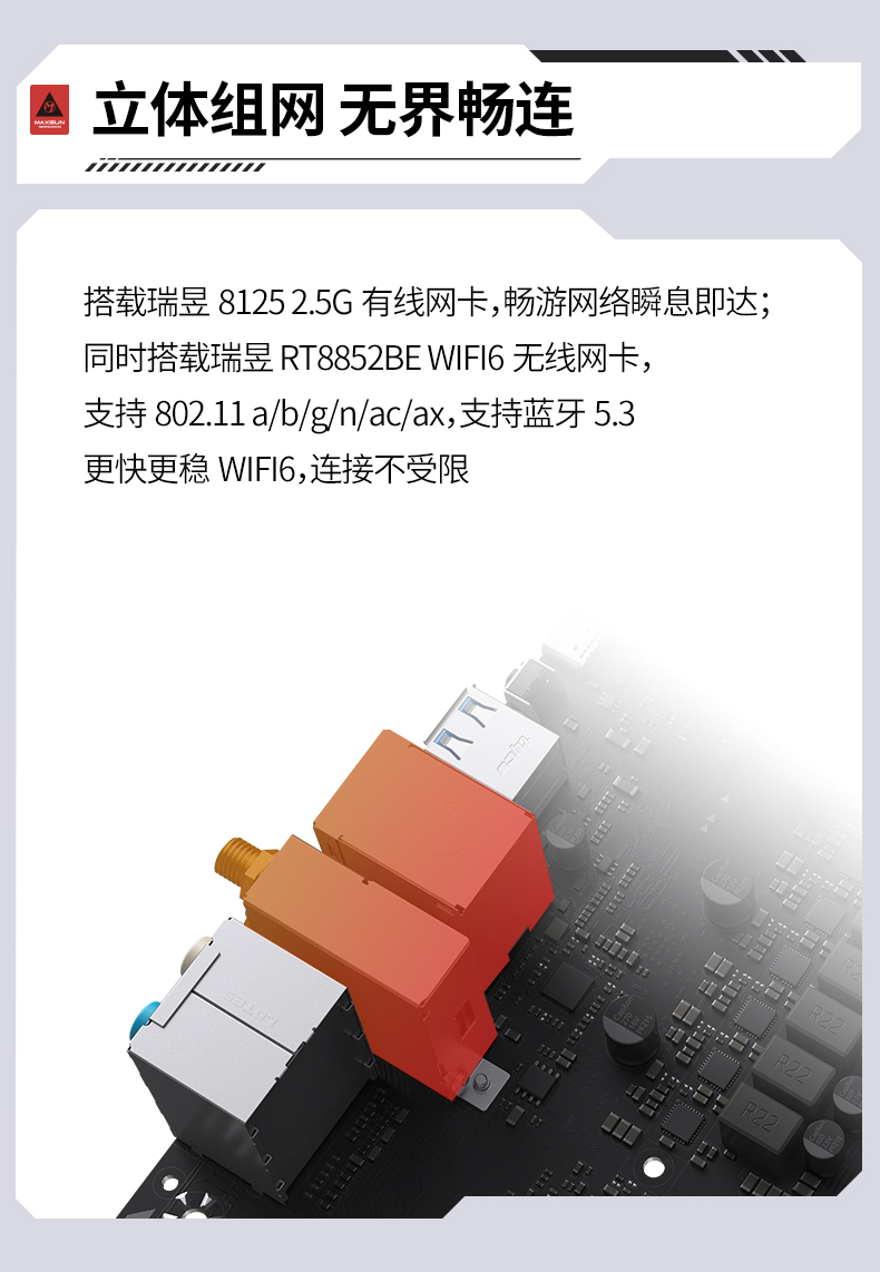 網(wǎng)絡(luò)體驗(yàn)是電競(jìng)玩家的 “生命線”,該主板搭載瑞昱8125 2.5G有線網(wǎng)卡,暢游網(wǎng)絡(luò)瞬息即達(dá);同時(shí)搭載瑞昱RT8852BE WIFI6無線網(wǎng)卡,支持802.11 a/b/g/n/ac/ax,支持藍(lán)牙5.3。更快更穩(wěn)WIFI6,連接不受限。像在《三角洲行動(dòng)》這類多人在線競(jìng)技游戲中,穩(wěn)定且高速的網(wǎng)絡(luò)能夠確保游戲延遲始終保持在較低水平,避免因網(wǎng)絡(luò)卡頓導(dǎo)致操作失誤,讓玩家盡情享受游戲樂趣。