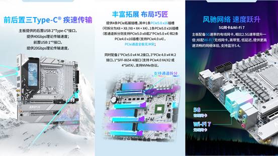 擴展方面,該主板提供4條PCle拓展插槽,其中1條PCIe 5.0 x16插槽支持靈活拆分,可根據需求調整為X8+X8 或 X8+X4+X4模式,滿足同時搭載高性能顯卡與PCIe擴展卡的需求;板載的SFF-8654 4i接口,可靈活擴展為PCIe 4.0 x4通道或4個 SATA 接口,適配多設備存儲方案。I/O區域的兩個40Gbps速率USB4 Type-C 接口,配合DP 1.4與HDMI 2.1視頻接口,輕松滿足多設備連接需求。網絡體驗同樣無需擔憂。它搭載 Intel BE200 無線網卡與 Realtek RTL8126 有線網卡,支持 Wi-Fi 7 與 5G 有線網絡,還具備藍牙 5.4 功能。無論是在復雜網絡環境下進行 128 人聯機對戰,還是連接無線外設,都能實現低延遲、高穩定的傳輸,讓你避免因網絡波動錯失戰機。
