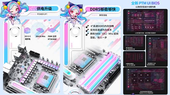 性能上這款主板同樣毫不妥協。16+1+1 相供電設計搭配核心供電 50A Dr.Mos,強悍的供電能力足以輕松駕馭英特爾酷睿Ultra 200S系列處理器的性能,即便在《戰地 6》滿負載運行時,也能保持穩定輸出,避免因供電不足導致的卡頓、掉幀。4 條雙通道DIMM的DDR5內存插槽經過優化線路布局,擁有 9066(OC)Mhz 的超頻潛能,玩家只需通過銘瑄 PTM UI 圖形化 BIOS,幾步簡單操作就能調整供電參數、拉滿內存頻率,輕松為《戰地6》優化整機性能,小白也能輕松上手。