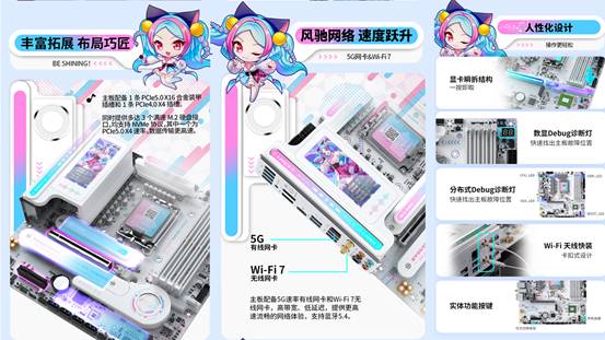 拓展性與網絡體驗更是直擊玩家需求。該1條PCIe5.0 X16合金裝甲插槽+1條 PCIe4.0 X4 插槽,搭配3個滿速M.2硬盤接口和 4個6G SATA接口,無論是加裝高速固態硬盤還是拓展其他硬件,都能從容應對。多人對戰時就怕網絡卡頓,這款主板搭載英特爾BE200無線網卡,支持Wi-Fi 7 和藍牙5.4,再加上5G有線網口的雙旗艦網絡配置,傳輸速度又快又穩,讓你在《戰地6》的百人對戰中告別延遲,快速響應每一次戰術指令。更貼心的是,顯卡瞬拆結構和 Wi-Fi天線快裝設計讓裝機、升級更便捷,數顯+分布式 Debug 診斷燈能一眼識別故障位置,省去繁瑣排查步驟,讓玩家專注享受裝機與游戲的樂趣。
