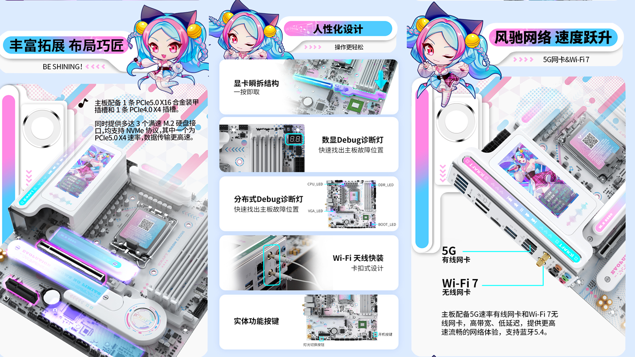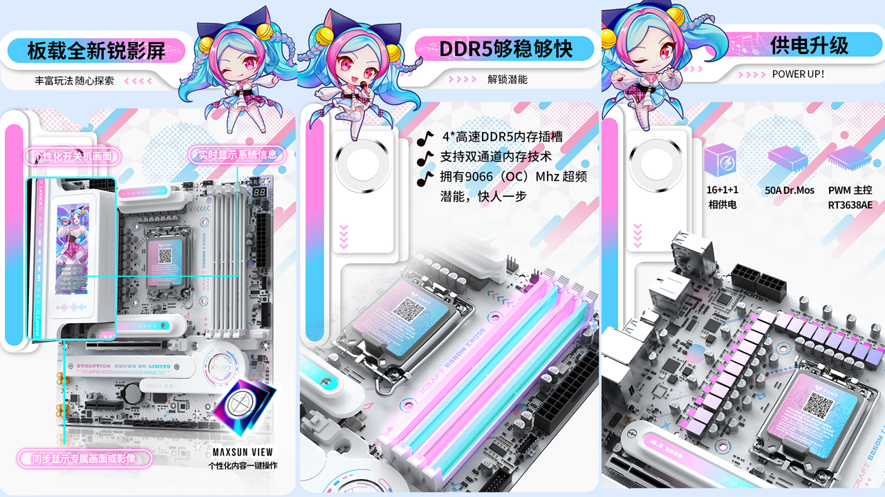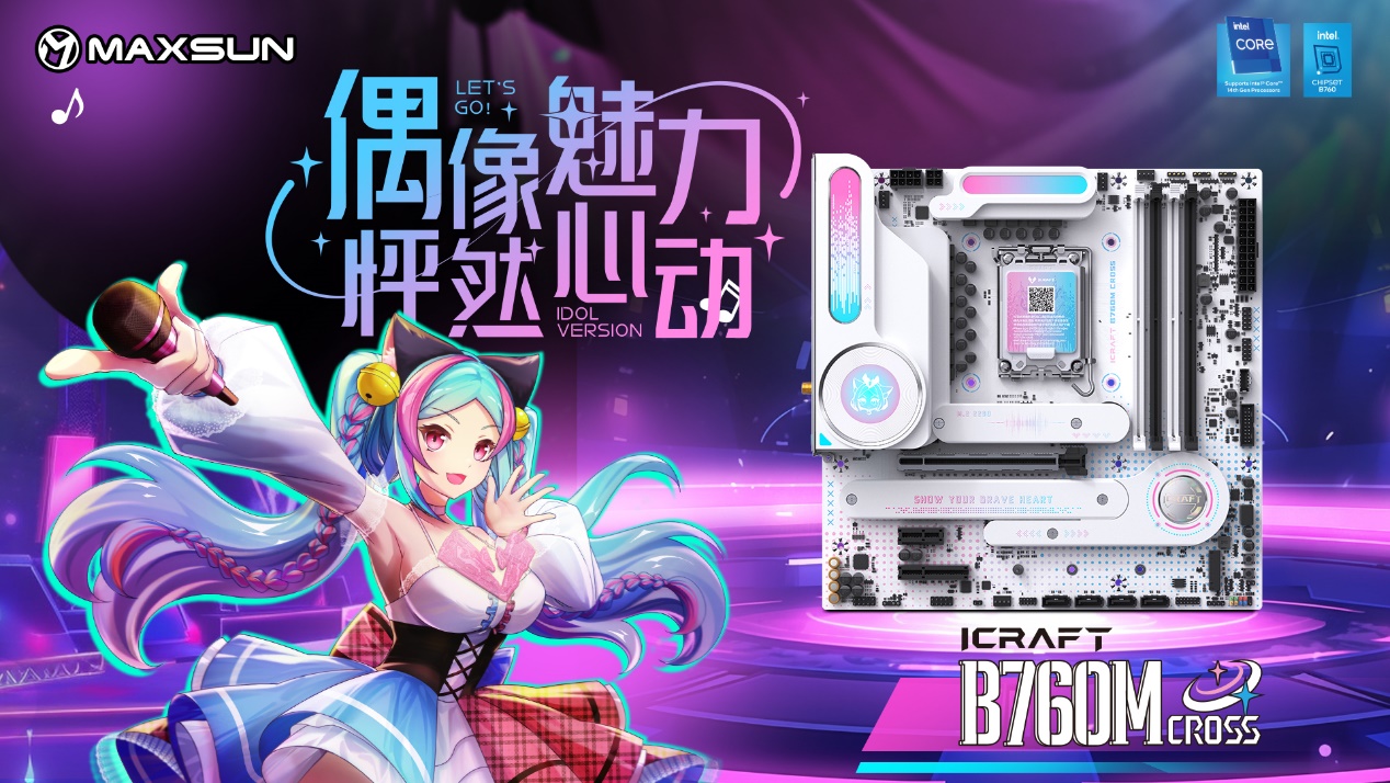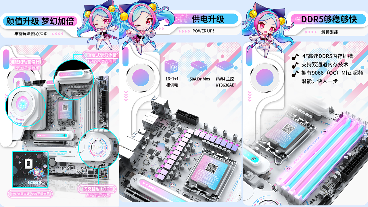 銘瑄iCraft B760M CROSS主板,外觀上粉藍配色,主板上的吉他裝甲以及多處的漸變設計點綴,加上全白的PCB和大面積的個性裝甲,吸睛度拉滿。值得一提的是主板上的創新式LED小屏幕,通電后可以發現這里是一個會眨眼的Q版璦珈,通過BIOS設置還能調節小璦珈的不同5種不同動作狀態,給整個DIY主機注入了新的活力。除了出眾顏值,性能同樣不容小覷。供電方面,主板采用了12+1+1相的供電設計,核心供電都是50A Dr.Mos,備4條雙通道DIMM的DDR5內存插槽,優化的線路布局,讓它擁有優秀的超頻能力,支持內存XMP,最高可至7600MHz。還搭配了一條PCIE5.0 X16全長合金裝甲插槽、一條PCIex1 插槽、和一條PCIe x4開放式插槽,存儲方面主板搭載3個M.2硬盤接口、4個6G SATA接口,無論是外接設備還是擴容存儲,都能輕松滿足,適配宅家多樣化使用需求。