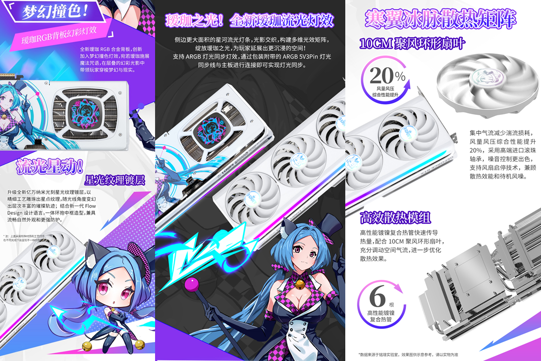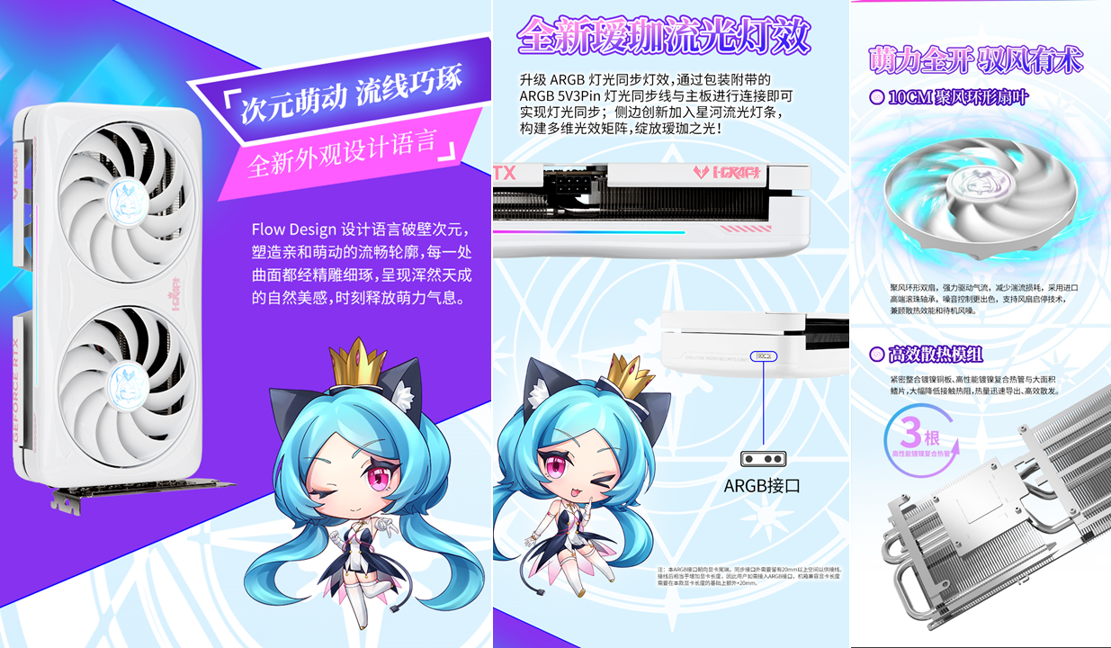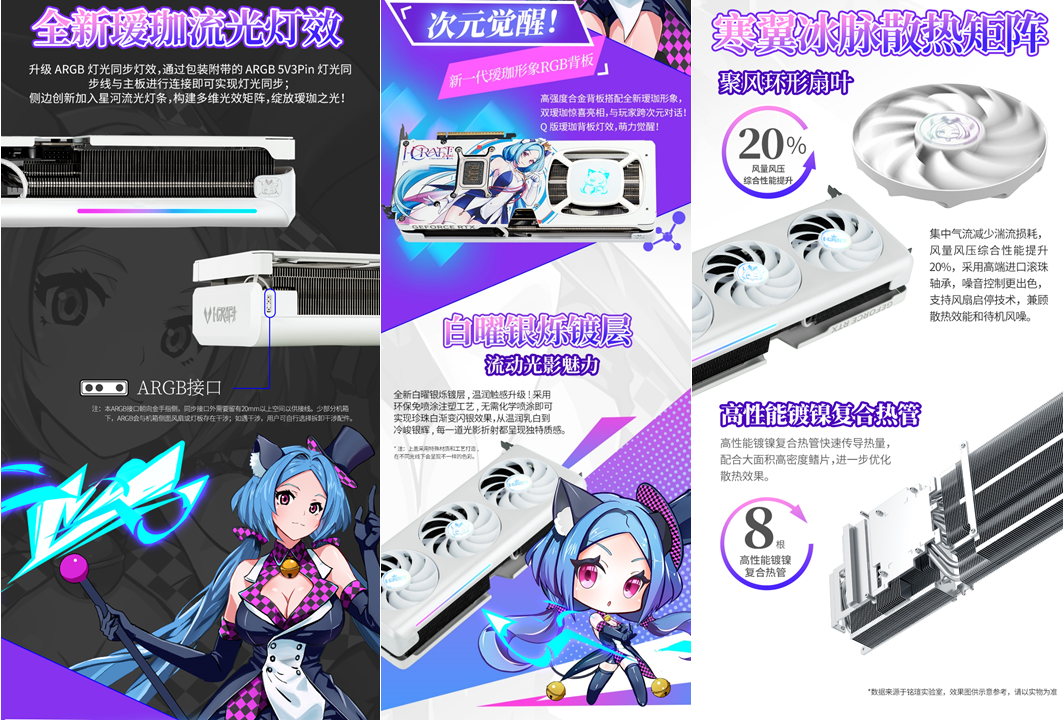 銘瑄GeForce RTX 5080 iCraft OC16G璦珈顯卡,升級 ARGB 燈光同步燈效,通過包裝附帶的ARGB 5V3Pin 燈光同步線與主板進行連接即可實現燈光同步;側邊創新加入星河流光燈條,構建多維光效矩陣,綻放璦珈之光! 高強度合金背板搭配全新璦珈形象,雙璦珈驚喜亮相,與玩家跨次元對話!Q版璦珈背板燈效,萌力覺醒! 性能上,依托Blackwell 架構滿血核心與 16GB GDDR7 顯存,運行《戰地 6》4K 高畫質并開啟光線追蹤與 DLSS 4 超分辨率模式時,遠景植被、遠處建筑紋理清晰可見,夜間作戰時的手電筒光斑、爆炸火光等動態光影效果無拖影;支持 NVIDIA Reflex 低延遲技術,鼠標操作響應速度提升顯著,近距離剛槍時瞄準更準確,再也不會因延遲錯失爆頭機會,助你在跨年戰場中所向披靡。