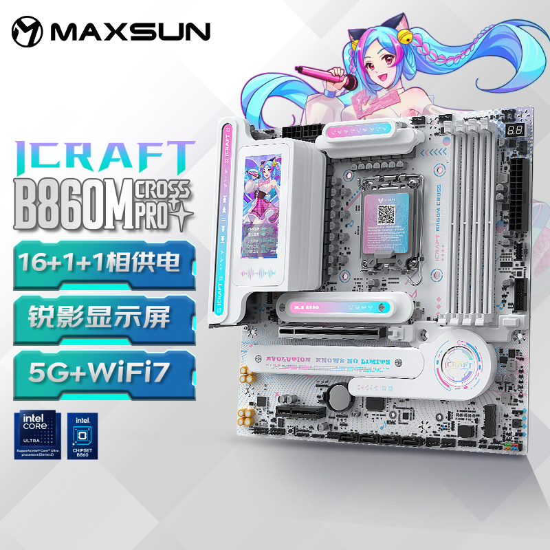 銘瑄iCraft B860M CROSS璦珈主板則為這份體驗提供了堅實支撐,采用新一代芯片組,相比 B760 主板性能進一步提升,全面支持銘瑄全新的PTM UI BIOS,操作更便捷。主板配備LED小屏幕,通電后會呈現活力滿滿的小璦珈眨眼動畫,魅力滿分!對比上一代,供電升級采用16+1+1相供電設計,核心供電50A Dr.Mos,輕松駕馭英特爾® 酷睿™ Ultra 9 處理器 285K;配備前后置雙USB-C®,后置USB4® 40G接口,支持最高40Gbps傳輸速率,數據傳輸更高速。并配備4條雙通道DIMM的DDR5內存插槽,優化線路布局,超頻能力更強,具備9066(OC)Mhz超頻潛能,盡情釋放偶像實力。