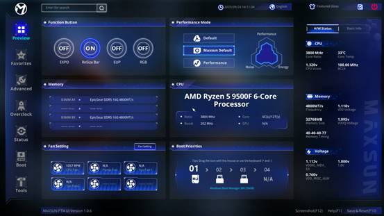 MS-Terminator B850M PRO II WIFI7 原生搭載了銘瑄全新的PTM UI BIOS。這款BIOS打破了傳統(tǒng)操作門檻,借鑒手機APP的交互邏輯,采用PTM設(shè)計理念(PC To Mobile),將所有功能模塊化后再進行聚焦式設(shè)計,讓所有交互層級不超過2層,手機端的卡片式體驗界面,讓用戶輕松、直觀、簡單進行個性化設(shè)置。無論新手還是資深玩家,都能輕松上手,快速調(diào)校出更佳的系統(tǒng)狀態(tài)。