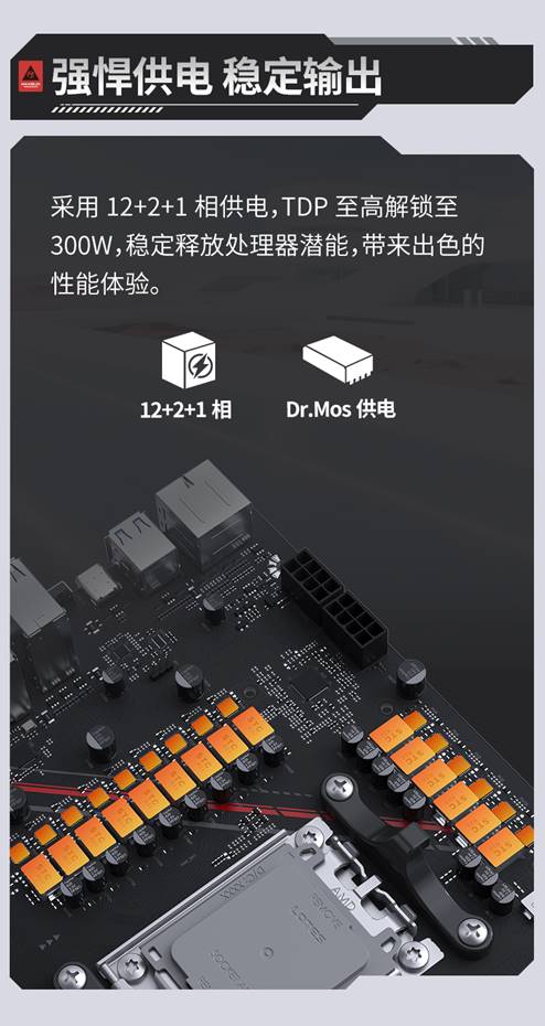 強勁性能離不開穩(wěn)定供電的保障。MS-Terminator B850M PRO II WIFI7 采用 12+2+1 相 Dr.Mos 供電設(shè)計,搭配優(yōu)質(zhì)元器件,TDP支持至高解鎖至300W。即使面對 AMD Ryzen™ 9 9950X3D等高性能處理器,也能提供持續(xù)穩(wěn)定的電力輸出,充分釋放CPU潛能,拒絕性能瓶頸。