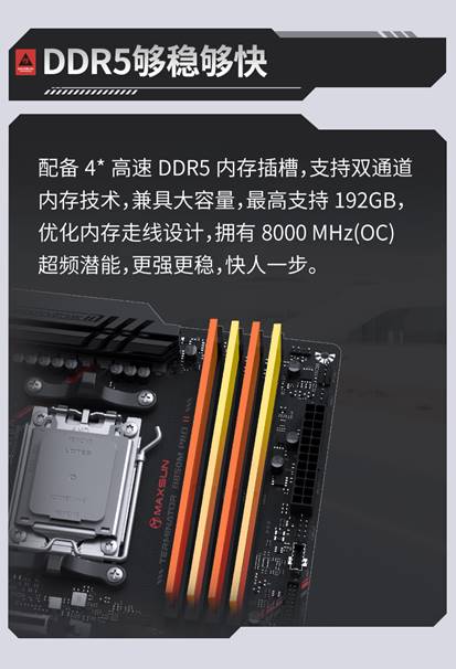 內(nèi)存方面,主板提供4*高速DDR5內(nèi)存插槽,擁有8000MHz(OC)超頻潛能,顯著提升響應(yīng)速度,讓你在學(xué)習(xí)和娛樂中快人一步。無論是多任務(wù)處理,還是進行數(shù)據(jù)密集型操作,都能感受到內(nèi)存性能提升帶來的便捷體驗。