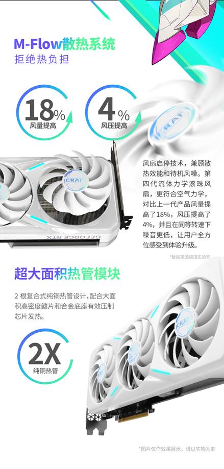 不僅性能能打,這款顯卡的外觀上設計清新亮眼,純白PC導風罩融合定制白晝旋光鍍層,觸感如陶瓷般圓潤細膩,定制璦珈合金背板上的藍紫色璦珈形象靈動吸睛,與正面鍍層相得益彰,為主機增添一抹清新亮眼的格調。更貼心配備一鍵燈光控制鍵,玩家可隨心切換燈效,讓柔和光影與《天國:拯救 2》的中世紀復古風格碰撞出獨特火花,打造專屬電競氛圍。
