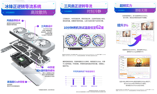 在顯卡性能日益強化的今天,散熱效能在一定程度上決定著硬件潛力的釋放程度。MAXSUN Intel Arc B580 iCraft 12G顯卡采用正逆轉導流散熱設計,相鄰風扇旋轉方向不同,大幅減少氣流干擾,提升散熱效率,溫度更低,噪音更低。其搭載4根6mm鍍鎳復合熱管,配合高密度鰭片矩陣和三風扇正逆轉導流散熱,在10分鐘Time Spy烤機測試中,溫度僅為62℃。無論是連續數小時鏖戰《三角洲》,還是高強度運行 3A 大作、處理 4K 渲染任務,它都能始終保持 “冷靜輸出”,告別因過熱導致的降頻卡頓。