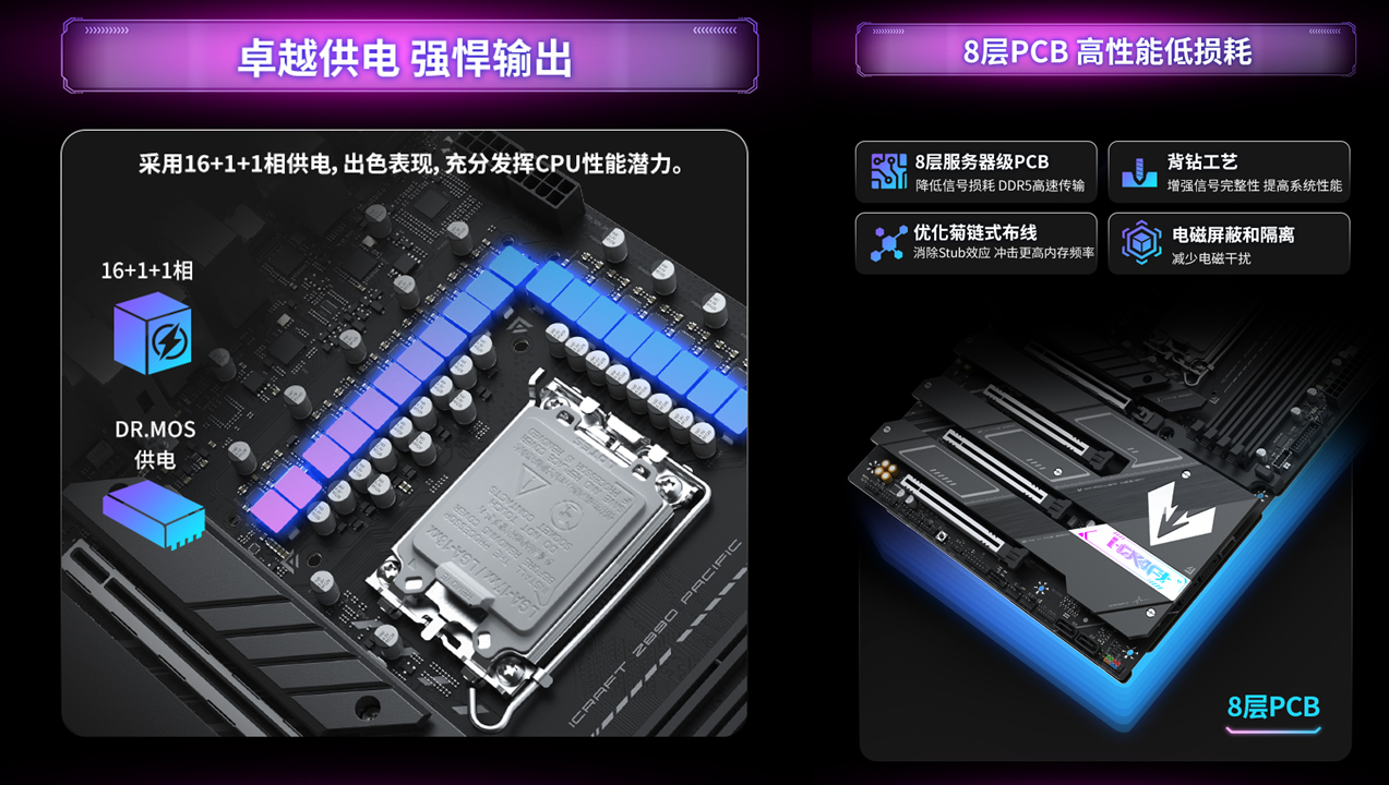 處理器能不能“跑滿”,關鍵看主板供電給不給力。英特爾酷睿Ultra 7 265K處理器搭載突破性的Arrow Lake架構,采用 20核心 20 線程設計,睿頻至高可達 5.5Ghz。這般強悍的性能輸出,對主板供電的穩(wěn)定性與持續(xù)性提出了更高的要求——而銘瑄iCraft Z890 Pacific主板,能高度適配這款處理器,充分釋放其澎湃性能。
