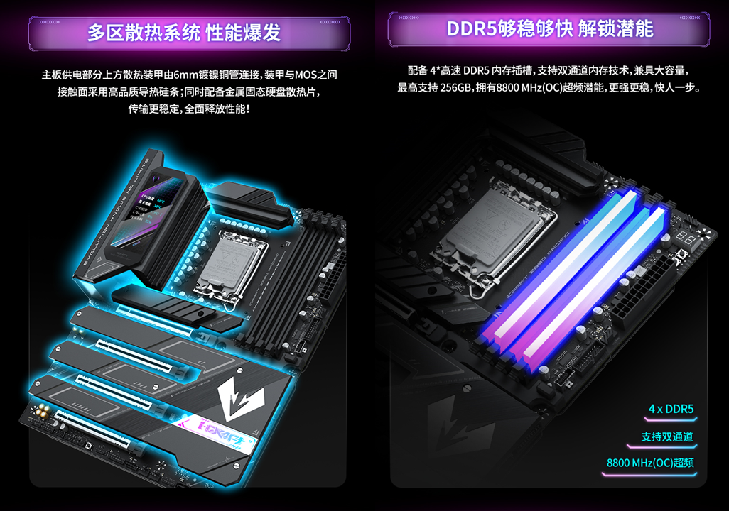 散熱設計方面這款主板同樣拉滿,供電部分上方的冰原散熱裝甲由6mm鍍鎳銅管連接,裝甲與MOS之間的接觸面采用高品質導熱硅條;同時配備金屬固態(tài)硬盤冰原散熱片,全面保障硬件冷靜運行,性能持續(xù)在線不 “掉鏈”。 內存方面,配備4條高速DDR5內存插槽,支持雙通道內存技術,最高支持256GB容量,還擁有8800MHz (OC)超頻潛能,搭配CUDIMM內存可輕松突破頻率上限,讓游戲的紋理加載速度大幅提升。