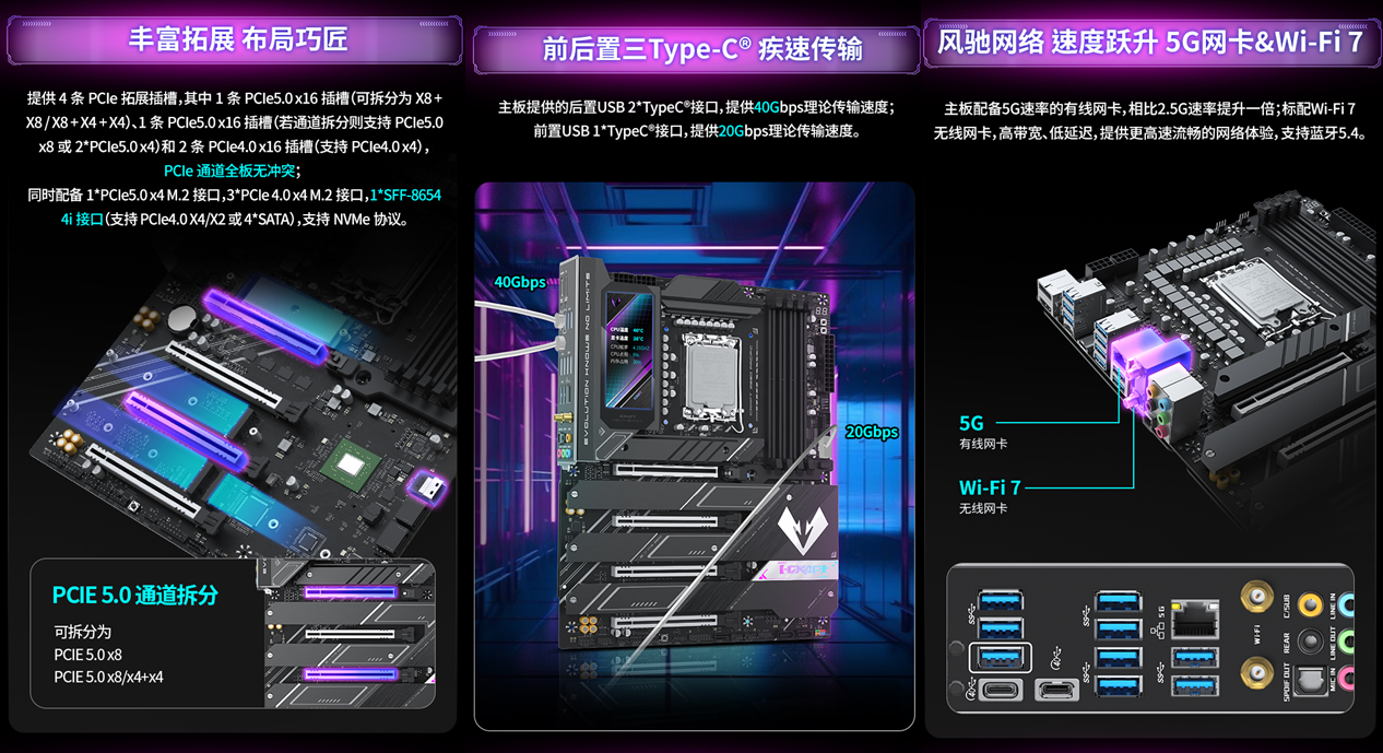 擴展方面也十分出色,該主板提供4條PCle拓展插槽,其中1條PCIe 5.0 x16插槽支持靈活拆分,可根據(jù)需求調整為X8+X8 或X8+X4+X4模式,滿足同時搭載高性能顯卡與PCIe擴展卡的需求;板載的SFF-8654 4i接口,可靈活擴展為PCIe 4.0 x4通道或4個 SATA 接口,適配多設備存儲方案。I/O區(qū)域的兩個40Gbps速率USB4 Type-C 接口,配合DP 1.4與HDMI 2.1視頻接口,輕松滿足多設備連接需求。網(wǎng)絡體驗同樣無需擔憂,該主板搭載 Intel BE200 無線網(wǎng)卡與 Realtek RTL8126 有線網(wǎng)卡,支持 Wi-Fi 7 與 5G 有線網(wǎng)絡,還具備藍牙 5.4 功能。無論是在復雜網(wǎng)絡環(huán)境下進行聯(lián)機對戰(zhàn),還是連接無線外設,都能實現(xiàn)低延遲、高穩(wěn)定的傳輸,讓你避免因網(wǎng)絡波動錯失戰(zhàn)機。