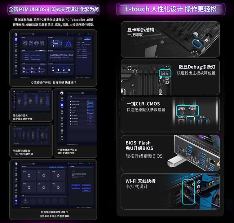 主板貼心的設計,更是讓裝機和使用體驗直接拉滿。全新升級的PTM UI BIOS,借鑒手機 APP 的交互邏輯,采用模塊化設計,交互層級不超過 2 層,手機端風格的卡片式界面,讓復雜的 BIOS 設置變得簡單易懂,即使是新手玩家也能輕松上手。顯卡瞬拆結構一按即取,不用費力擰螺絲;分布式 Debug 診斷燈能快速定位故障,小白也能輕松排查問題;CLR_CMOS 快捷按鈕、BIOS_Flash 免 U 升級、Wi-Fi 天線快拆等設計,全程省心省力。